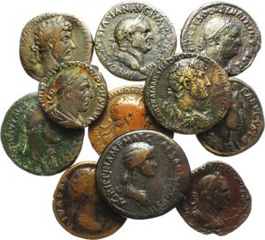 LOT de 11 sesterces comprenant 1 sesterce d’Agrippine mère R/ Carpentum. Vespasien, Trajan, Hadrien, Balbin et divers.