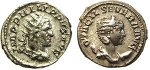 LOT de 2 ANTONINIENS de billon comprenant : Philippe père 244-249 Ap. JC. antoninien 3,65 gr. R/ Lion. C. 173 TTB et Otacilie épouse de Philippe père antoninien. 4,13 gr.R/ hippopotame. C. 64 Presque Sup. Les 2 MONNAIES.