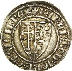 Italie. Royaume de Naples. Charles II d’Anjou 1254-1309. Salut d’argent 3,27 gr. A/ Ecu parti de Jérusalem et d’Anjou. R/ L’Archange Gabriel debout. à g. saluant la Vierge à dr.; au centre un lis dans un pot. Bd. 826 ; P.A. 3971. Belle...