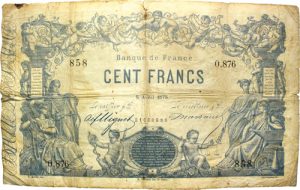 100 FRANCS type 1862 « Indices Noirs » 5 avril 1875. Alphabet 0.876 n° 858. Fay. A39.11. Fentes, pliures, trous d’épingle.