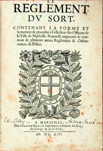 LE REGLEMENT DU SORT. Contenant la forme et la maniere de procéder à l'eslection des Officiers de la Ville de MARSEILLE. Reueu & augmenté de nouvueau de plusieurs autres Reglemens & Ordonnances de Police. Marseille, Claude Garcin, 1654.