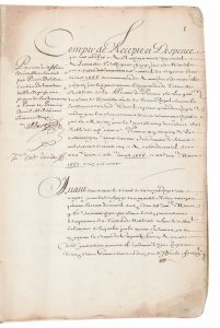 [MANUSCRIT] Original des comptes des amendes jugées contre les usurpateurs du titre de noblesse de la province de Provence. Registre de compte de recettes et dépenses présenté au Conseil Royal des Finances de St Germain-en-Laye du12 janvier 1672,