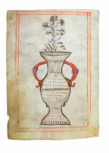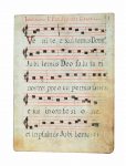 Recueil MANUSCRIT in-folio à l’encre brune et rouge sur parchemin ( 30 x22 cm) ; [1] feuillet formant le plat supérieur avec titre au recto et un dessin naïf polychrome représentant un bouquet de fleurs dans un vase au verso -10 feuillets MANUSCRITs chiffrés avec notation carrée sur 5 portées par page et texte en latin- [1] feuillet formant le plat inférieur. Plusieurs pages avec usures, le recto du feuillet 10 est taché. Ce recueil est conservé dans une reliure en parchemin de l’époque usagée. (détachée avec déchirures et manques)