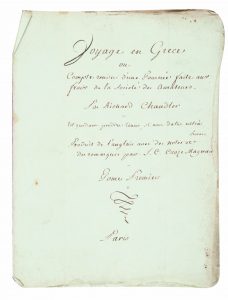 [MANUSCRIT] CROZE-MAGNAN Voyage de Chandler Voyage en Grèce ou Compte-rendu d'une Tournée faites aux frais de la Société des Amateurs par Richard Chandler traduit de l’anglais avec des notes et des remarques par S.C. Croze Magnan. Paris 20...