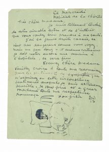 « Ce mercredi Hopital de la charité très chère madame, Je suis tellement touché de votre aimable lettre et de l’interét que vous voulez bien prendre à ma santé .J’ai la jambe droite cassée, ce n’est pas dangereux comme vous voyez mais un peu long -et aucune contusions. Je dois rester encore une semaine à l’hopitale , ce sera fini. Excusez chère Madame veuillez croire à toute ma reconnaissance pour les sentiments de sympathie que vous m’exprimez en cette circonstance, sentiments auxquels je suis extrêmement sensible. Je vous prie et agréer madame toute ma respectueuse hommage Foujita » Cette lettre écrite depuis l’Hôpital de la Charité à Paris où l’artiste était hospitalisé suite à un accident de la circulation est enrichie d’un rare autoportrait à la plume dans lequel Foujita se représente en train de lire et fumer (!!) sur son lit d’hôpital.