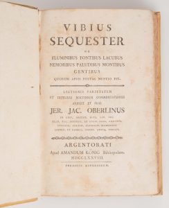 VIBIUS SEQUESTER - De Fluminibus, Fontibus, Lacubus, Nemoribus, Paludibus, Montibus, Gentibus quorum apud Poetas mentio fit. Lectionis varietatem et integras doctorum commentationes adjecit et suas Jer. Jac. Oberlinus. (…) Argentorati [Strasbourg]...