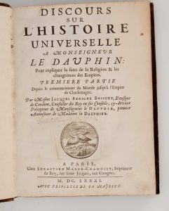 ÉDITION ORIGINALE, texte à grande marge de cet ouvrage que Bossuet composa vers 1677 pour l’instruction du grand Dauphin, fils de LOUIS XIV.