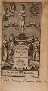 CHARRON (Pierre). – De la Sagesse. Trois livres. Leyde, Jean Elsevier, s.d. [post. 1656]. In-12, (12)-621p-(12p). [saut de page de p.264 à p.295 et p.366 à p.377.] Plein maroquin, dos lisse orné, triple filets dorés aux plats, contreplats avec...