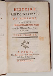 SUETONE. - Histoire des douze Césars traduite par Henri Ophel LOT de la Pause avec des mélanges philosophiques & des notes. Paris, Saillant & Nyon, 1771. 4 vol. In-8. Plein veau. Éditionbilingue latin-français. Bon état.