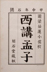 Il s’agit du deuxième ouvrage chinois imprimé en France. Il reprend le texte chinois en sinogrammes (morphèmes) imprimées sur 143 feuillets lithographiés à Paris en 1824 par le comte Charles-Philibert de Lasteyrie, philanthrope et mécène qui joua un grand rôle dans le développement de la lithographie en France. Il s’agit de l’ouvrage de Meng –Tseu considéré par les Chinois comme l’un des 4 livres par excellence ou le quatrième livre canonique du second ordre. Il manque les 2 tomes de la traduction latine vendus séparément à l’époque respectivement en 1826 et 1829, de A.-S. Julien Eminent sinologue, élève de Abel Rémusat. Il traduisit ensuite les plus grands textes de la tradition philosophique chinoise.