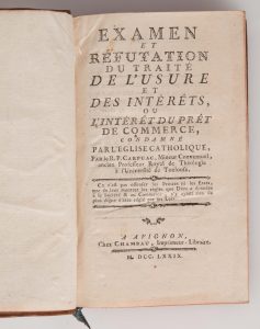 SOUCHET. - Traité de l'usure servant de réponse à […] M. Prost de Royer. Paris, 1778, In-12. XII-249p-privilège. Plein veau, triple encadrement dorés aux plats. Bon état. Il est joint : CARPUAC (R. P.), Examen et réfutation de l'usure et des...
