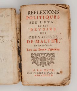 BOYER D'ARGENS (Luc de). - Réflexions politiques sur l'état et les devoirs des Chevaliers de Malte. La Haye, Pierre Paupie, 1739. In-12, (4)-150p-(1). Brochage en papier marbré, en attente de reliure. 4 figures numérotées 4, 6, 7, 8. Bon état....