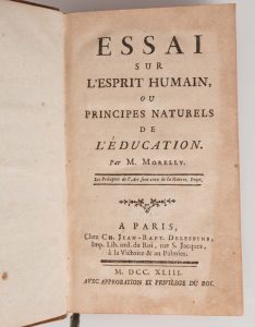 MORELLY (Abbé). - Essai sur l'esprit humain, ou Principes naturels de l'éducation. Paris, Delespine, 1743, In-8. (13)-369p. Plein veau, dos à nerfs orné.ÉDITION ORIGINALE. TRÈS BON ÉTAT.