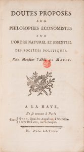 MABLY (Gabriel BONNOT Abbé de). - Doutes proposés aux philosophes économistes sur l'ordre naturel et essentiel des sociétés politiques. La Haye, Paris, Nyon & Veuve Durand, 1768. In-12. Viii-316p. Plein basane. Dos lisse orné.ÉDITION...