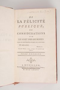 CHASTELLUX (de). - De la Félicité publique, ou Considérations sur le sort de l'homme […] Nouvelle édition, revue, corrigée & augmentée par l’Auteur. Bouillon, de l'Imprimerie de la Société typographique, 1776. 2 vol. In-8....