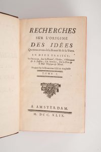 [HUTCHESON]. - Recherches sur l'origine des idées que nous avons de la Beauté et de la Vertu en deux traités. (…) Amsterdam, 1749, 2 t. en 1 vol. In-12. (3)-18p-192p-(2)-390p-(1). Traduit sur la 4ème édition anglaise. Vignettes. Plein...