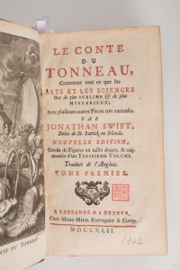 SWIFT (Jonathan). – Le Conte du tonneau […] orné de figures en taille-douce & augmenté d’un troisième tome. Lausanne & Genève, Bousquet, 1741, 3 t. en 1 vol. In-12. (10)-312p+(7)-296p+(1)-xvi-280p. Illustré d’un 1 frontispice et 9...