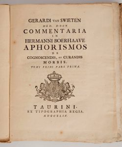 Gérard Van Swieten (1700−1772), médecin ordinaire de l’impératrice Marie−Thérèse, commente longuement chaque aphorisme de Boerhaave, son professeur, et rappelle les principes généraux auxquels le médecin hollandais fait allusion. Assez bon état, dos abîmés. Rousseurs éparses, quelques travaux de vers.