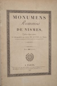 SEYNES (Alphonse de). - Monumens romains de Nismes, dessinés d’après nature et lithographiés. Paris, imprimerie lithographique de C. Motte – Imprimerie Firmin-Didot, 1818. In-fol. 10p. 12 planches sur 16. Couverture cartonnée imprimée. Bon...