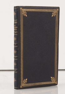 In-12, plein chagrin noir, dos orné, roulettes, filets, écoinçons dorés sur les plats.