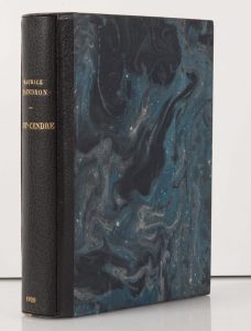 Grand in-8 carré. Maroquin du Cap bleu marine, et chemise à bandes et à rabats de maroquin de la même teinte, étui bordé. Dos lisse portant le titre composé de petites pastilles mosaïquées de maroquin rouge et moutarde. Plats décorés de grandes compositions ovales réalisées à la façon des mosaïques par de nombreuses petites pastilles émeraude, vert pâle, lavallière, bleu, blanc, tango, ivoire et moutarde mosaïquées. Large bordure intérieure agrémentée de cadres de "perles" rouges et de listels de veau doré mosaïqués. Contreplats et gardes de reps bleu nuit, doubles gardes. Toutes tranches dorées. Couv conservée.
