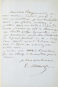 Dites des choses de ma part à Lejosne, [chez qui il fit la connaissance de Baudelaire] à Fioupou, à Stevens, à tous nos amis de Bade. Adieu cher ami, je vous serre la main. Ed.Manet». (2 pp. in-16).