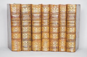 7 vols. 4to, mm. 250 x 190; Full contemporary calf binding, backs with 5 golden ribs and label ; pp. [10], XXII, [2], 435 [i.e. 457], [1], with the portrait of Ferdinando of Parma engraved by Zucchi e 13 copper plates out text; 2 parts, pp. [[6], 431, [3], 129, [3], with 19 copper plates out text; pp. [6], 527, [1], with 13 copper plates out text.; pp. [6]+447, with 7 copper plates out text; pp. [2], 486, [4], with 11 copper plates out text; pp. [4], 391, [1], with 11 copper plates; 1768, 2 parts, pp. [4], 329, [13]; 110, [2] with 5 copper plates out text. Vignette on Title page, Headtitles and initials engraved. Ex-libris inside cover “De la Bibliotheque de l’Ing.r. Brunati”.