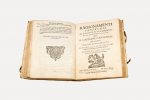 4to; Contemporary smooth vellum binding made by a leaf of the XVIth century, with musical notes; leaves 8, 148; Printer’s device on Titlepage, woodcut Ornaments, Initials, Headpieces and Finals, Roman and Italyc type, Author’s portrait depicting whistles (Zufoli) of Corinth. Nice condition.