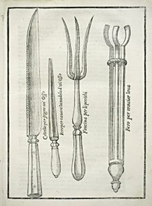 RARE EDITION ILLUSTRATED. The Trinciante is the first treaty devoted entirely to the art of chop and cut the meat, and are accompanied by illustrations that depict the various instruments in order: forks, knives, awls, pincers in various fashions. The four plates in full page are printed on pages 10, 11, 96 and 97: the two are folded towards the end of the volume. In addition to tools for shredding they depict a turkey ready to be cut, a decorated table for lunch and a pond with fish and a fisherman. From page 83 starts the Add, on page 141, the master of the house, these two works, each with its own title page, written by Knight Royal Fusoritto and are especially dedicated to the art of the banquets.