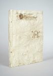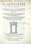 4to, mm. 222x162; Legatura di poco posteriore in piena pergamena, sign of two ties, drawings by Triscele, the symbol of Trinacria, and “Σικελiωταν” written on the front cover: pp. [8], 162, [2]; 3 parts with Title-pages; Printer’s device on Title pages and at the end, 4 woodcut plates within the text, 2 woodcut plates folded out text. Note of posession on Title page.