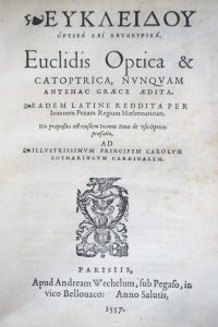EUCLIDES. Eukleidou Optika kai Katoptrika. Euclidis Optica & Catoptrica, nunquam antehac Graece aedita. Eadem Latine reddita per Ioannem Penam regium mathematicum.Paris, Andreas Wechel, 1557.