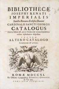 FIRST EDITION. The catalog of the prestigious library of Cardinal Joseph Imperiali was drafted by Fontaniniat the time his librarian: over twenty thousand works are described in the first part ordered by author, in the second by topic.