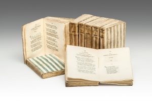 RARISSIMA EDIZIONE ORIGINALE, PARTICOLARMENTE DIFFICILE A TROVARSI COMPLETA di tutti gli otto volumi, in legatura originale. Questa importante pubblicazione contiene i primi versi a stampa del Foscolo. I volumi IV e V contengono significative poesie giovanili, tra le quali l’ode La verità, che è in assoluto il primo testo poetico a stampa del Foscolo. Nel V volume ci sono l’elegia Le rimembranze, l’inno Al sole, il sonetto in morte del padre: Era la notte, e sul funereo letto, il sonetto A Venezia. Tutte queste composizioni appaiono qui per la prima volta. Nel V volume si trova l’Ode a Bonaparte liberatore, già pubblicata in precedenza ma che riceve qui la sua definitiva consacrazione; compare poi l’ode Ai novelli repubblicani, qui in seconda edizione ma con molte varianti rispetto alla prima pubblicazione. Oltre alle opere del Foscolo, gli otto volumi dell’Anno poetico contengono anche i pregevoli versi del Parini intitolati Alla musa, nonché poesie di Monti, Pindemonte, G. B. Giovio, Cesarotti, Bettinelli. Segnaliamo infine Alfieri, che apre il V volume con l’ode Al generale Washington, Tu rapitor del fulmine celeste, in PRIMA EDIZIONE.