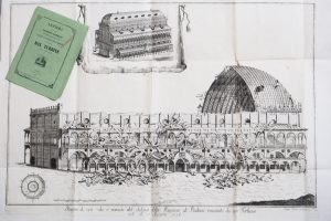 VERY RARE ORIGINAL EDITION The work is accompanied by the splendid plate engraved by Fossati. The press is entitled "Design of what remained of the Salone della Ragione ..."; sheet mm. 740x640, engraved mm. 655x460. Bottom right the word "architect Giorgio Fossati inc. Venice"; under the title. On that Tuesday in August 1756 the turbines, which also crossed the Euganean causing considerable damage, determined the opening of the roof of the salon, that much impressed the Paduan. The famous Paduan scholar provides detailed information about the claim in the form of letter Marcantonio Taleoni of Osimo. The board of Fossati, who impeccably documents the serious damage, it quickly became much sought after and it is very rare to come by, especially in this perfect state of preservation. Very curious and very rare also is the enclosed booklet in which it reprinted on green paper letter Abbot Gennari. Lauro 136.