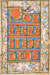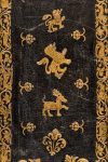 Splendid contemporary binding of Granada, in Moroccan dark brown, dry sides with threads that bound concentric frames gold composed phytomorphic friezes, medallions with heads with turbans, military armor and ornaments; within the compartments, lions, deer, a representation of the cross, wheels and stylized flowers, all in gold embossed small irons; gold tooling on the spine also 5 nerves, doublure blue silk. •Illuminated manuscript on parchment, 49 sheets not numbered, the first and last 3 blank. Text Regle 34 rows in beautiful chancery with numerous initials and calligraphic friezes, 23 illuminated initial letters, cards and 4 to 5 recto fully illuminated in polychrome and gold burnished with great coat of arms depicting the arms of the family De Velasco and floral borders inhabited by putti monsters and anthropomorphic. Bookplates Prince of Soragna pasted to the first inside cover.