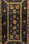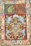 IMPORTANT PARCHMENT MANUSCRIPT ILLUMINATED, in magnificent contemporary binding. Gorgeous card Executoria, which bears the date at the bottom of March 5, 1563 and is made to draw up "parchment" by the Court of Justice of Granada: concerns a lawsuit filed by Andres de Velasco, a member of one of the most important families of the Spanish nobility. A very fine polychrome decorations: two pages appear fully illuminated by beautiful frames figured with cherubs, flowers, dragons, allegorical figures, left the inscription in gold "Don Prince" and underneath the large family crest De Velasco, with points in gold alternating points with bells in blue and silver, on the right the inscription in gold "Por la gracia do Dios"; the written characters are processed in arabesque. Same display of pomp and elegance is found in 23 large initials, the letters in gold stand on the colors red, blue and green.