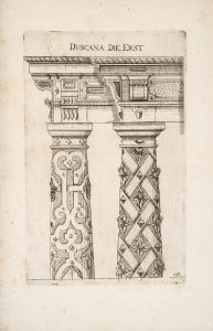 VERY RARE ORIGINAL EDITION Interesting architectural treatise of the late German Renaissance which shows the five orders of the columns: Tuscan, Doric, Ionic, Corinthian and Composite. Many boards are dedicated to technical details with examples of entablatures, string courses and scrollwork. Jacob Guckeisen, german cabinetmaker, writer and engraver, is recorded as a cabinetmaker and citizen of Strasbourg from 1596. He appears to have been a pupil of the architect Johann Schoch, who designed the magnificent Schloss Gottesau, near Karlsruhe, and the Friedrichsbau of the Heidelberg Schloss; wrote several works devoted to masons and carpenters. Hans Jakob Ebelmann, c. 1570-1609, german cabinetmaker and printmaker. Working as a journeyman cabinetmaker at the Zimmerhof in Strasbourg after 1590, he came into contact with Hans Schoch and probably Wendel Dietterlin. In 1590 the two artists began a fruitful collaboration in the publishing field.