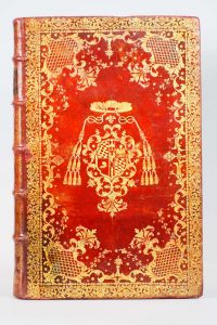 Folio, cm. 395x250; •Beautiful Armorial roman binding in red morocco, last quarter of the eighteenth century, spine with five raised bands; in the panels, a central acorn, surrounding foliage and set aside tapes, an green morocco label with gilt title, endpapers with xylographic ornamentation, cut of the cover adorned with geometric friezes, gilded cuts; pp. [34], 520, CIX. Coat of arms in the woodcut title-page, text on two columns. •Armorial roman binding of the last quarter of the eighteenth century, decorated, with gilding cleverly made. Red morocco with rich decorations: outer frame with phytomorphic motifs alternating with twisted ribbons; in the cover, decorated inside with a frame of chain boxes, stylized acanthus leaves, stars and pylons in the corners. At the center of the dishes the large coat of arms surmounted by the prelate Archbishop hair with ten tassels: under the Cardinal's hat an angel. Within foliated acanthus, the shaped emblem: quartered, the first and fourth quarter with decorative diamond shapes, the second with crowned eagle, the third with squirrel. The ornamental plant and the kind of frame testify to the Capitoline origin of the binding; in particular, the high quality of the leather used and the gilding suggest a primary workshop.