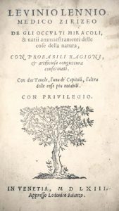 LEMNIUS, Levinus. De gli occulti miracoli, & varii ammaestramenti delle cose della natura, con probabili ragioni, et artificiosa congiettura confermati. Venezia, Lodovico Avanzo, 1563.