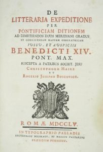 The work concerns the shape of the Earth: Benedict XIV decided to measure the arc of the meridian, on the basis of shipments of Maupertuis and Clairaut, Bouguer and La Condamine, who had indicated a new figure of the Earth. The work was undertaken by the father Boscovich and Christopher Maire, who measured a meridian arc between Rome and Rimini, an operation that committed the two scientists for about two years.