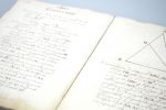 Manuscript vol. 4to, mm. 220x165; Contemporary full calf binding, gilded tilte on the spine; pp. 6 nn., with dedication, Pictorial Frontispiece, Titlepage, 247. Dedication on the first leaf “Ad usum Polloni 1721”, al recto la scritta “Da mihi ubi consistam, Terramque movebo”, curious allegorical depiction in frontispiece with Archimedes trying to lift the world, Title page with the title within baroque frame, numerous geometric figures in the text. Cursive handwriting clear, easy to read, brown ink.