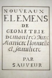 Non abbiamo notizie certe circa l’autore, ma dovrebbe trattarsi di Joseph Sauveur [1653-1716], "lange Zeit Privatlehrer d. Mathematik... darauf 1686 Prof. d. Mathematik am Collége Royale... u. 1703 Examinator d. Ingenieure" [Poggendorff, II/759-60]. L’autore fu anche un grande esperto di acustica musicale. Quérard, VIII/487, cita in effetti un suo testo [postumo] di Géometrie elémentaire et pratique, avec de notes, par G. Leblond [1753].