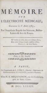 MARAT Jean-Paul. Mémoire sur l'Electricité Médicale couronné le 6 Août 1783, par l'Académie Royale des Sciences, Belles-Lettres & Arts de Rouen. Paris, De l'Imprimerie de L. Jorry, N.-T. Méquignon, 1784.