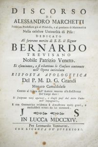 MARCHETTI, Alessandro. Discorso … si ribattono le Censure contenute nell’opera intitolata Risposta Apologetica del P.M.D.G. Grandi.Lucca, Venturini, 1714.