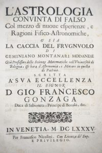 MONTANARI, Geminiano. L’Astrologia convinta di falso col mezzo di nuove esperienze e ragioni Fisico-Astronomiche o’ sia La Caccia del Frugnuolo. Venezia, Nicolini, 1685.
