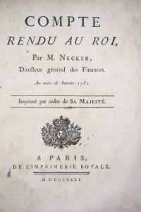 NECKER, Jacques. Compte rendu au Roi par M. Necker Directeur général des Finances Au mois de janvier 1781. Imprimé par ordre de sa Majesté. A Paris, De l’Imprimerie Royale, 1781.
