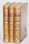 3 vols. 4to, mm. 240x185; Contemporary full calf binding, spine with 5 ribs with gilded titles and ornaments, red edges; pp. [8], XXXVIII, [2], 420, 2 bl, 28 copper plates out text and 2 tables out text; pp. VI, 423, 1 bl., 32 copper plates out text; pp. VI, 566 [i.e. 562, Leaf 2L2v numbered “268 ad 272”], [2, ult. bianca], 4 tavv. in r. rip.f.t. Tre Frontespizi in rosso e nero con vignetta in rame col ritratto di Newton inciso da Duflos.