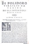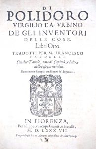 VERGILIO, Polidoro. De gli Inventori delle cose… Tradotti per M. Francesco Baldelli. Firenze, Filippo e Iacopo Giunti, 1587.