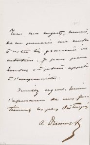 Lettera di cortesia firmata dello scrittore francese autore de La Dame aux Camelias nella quale comunica al corrispondente di non poter recarsi ad un incontro precedentemente concordato perché deve recarsi a Londra, dove è stato chiamato “à l’improviste”.