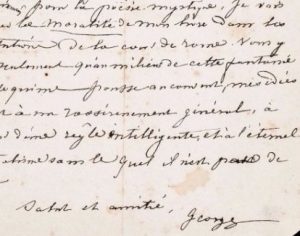 8vo, mm. 200 x 130; 1 c. con 25 righe e firma in calce; grafia in corsivo, inchiostro nero, testo sul recto. Al verso autentica di Luigi Calamatta, 1801 - 1868, incisore italiano, consuocero della Sand, giacché sua figlia sposò Maurice, figlio della scrittrice.